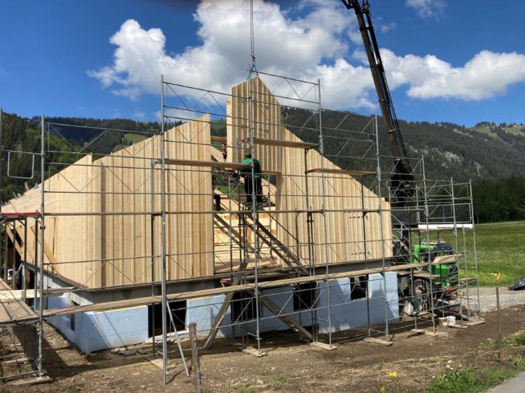 In unserer Werkstatt haben wir die Möglichkeit, grössere Bauteile zu produzieren, wie zum Beispiel Wand-, Dach- oder Bodenelemente. Bei dieser Bauweise kann in der Werkstatt sehr viel vorgefertigt werden. Dies bringt auf der Baustelle eine kürzere Bauzeit mit sich.